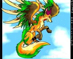 8.Внешность.рыжа зеленая волчица с феолетовыми ушками и с крылашками и зелено рыжей хвост